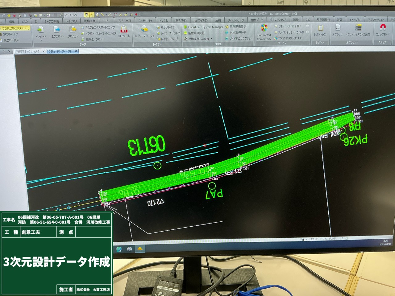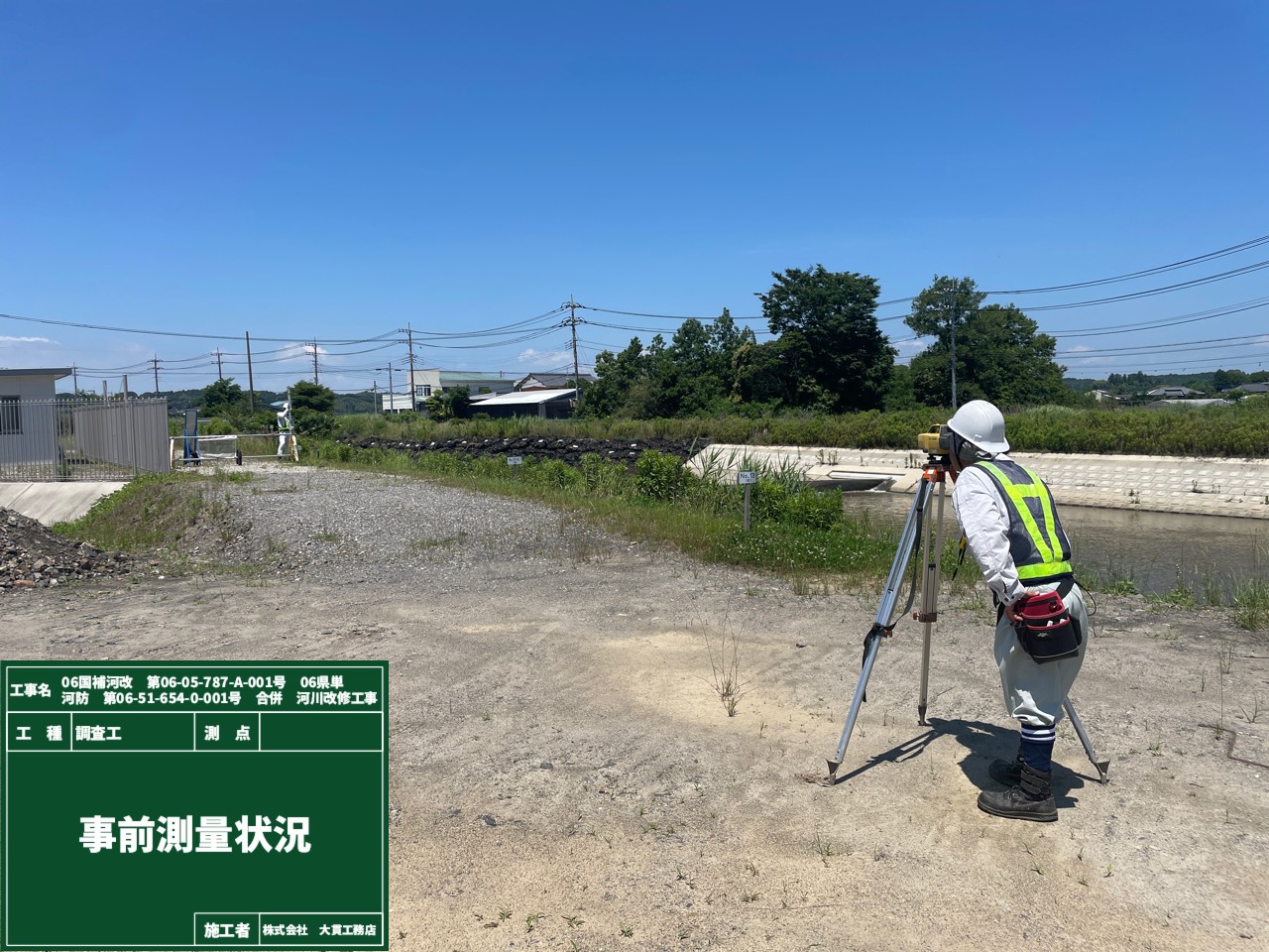 事前測量と言って、工事に入る前に「現在の地形や構造物の位置・高さ」を正確に測って記録しています!