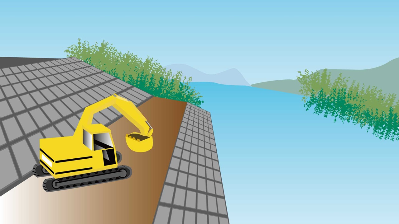 石川川の水辺の土砂流出や浸食を防ぎ、堤防の安定性を高めるために、鋼矢板を地盤に打ち込んで連続した壁(矢板壁)を築造する工事です。護岸を安定させることで、堤防の決壊を防ぐことができます。